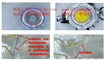 4.2.造成断线的因素众多,从不良样品分析看,透镜内壁边缘压弯折金线造成金线破损是根本原因。且所有分析的未死灯的良品中,拆下透镜,都可以发现,金线弯折处是直接接触透镜边缘,金线与透镜之间并未有胶体隔离,极易于使金线与透镜之间形成摩擦使金线破损断线;另从过去的异常“荧光粉处断线”来看,可以说明“外力致使金线断线”这一点。